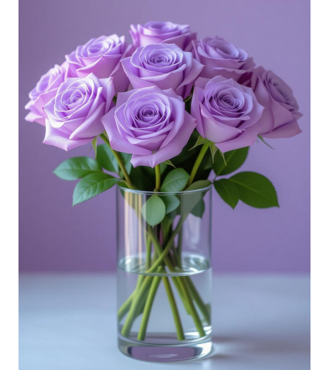 A stunning bouquet of soft lilac roses arranged in a clear glass vase, creating a calm and elegant look. The delicate pastel purple petals and fresh green leaves give a fresh, romantic feel, making it perfect for home décor, gifting, weddings, anniversaries, or special occasions. This floral arrangement adds a luxurious and soothing touch to any room with its graceful color and timeless beauty.